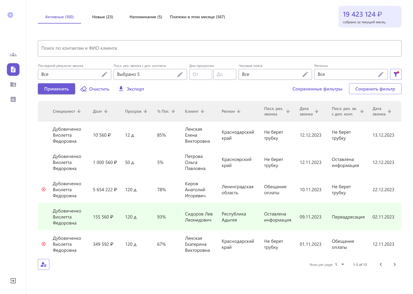 Система построена вокруг работы с контрактами, то есть выданными финансами. Она обладает развитой системой ролей, позволяющей эффективно управлять взаимодействием с клиентами с обязательствами. Система интегрирована с кредитным конвейером Brainysoft для получения информации о займах и клиентах. В системе предусмотрены механизм назначения контрактов на специалистов отдела взыскания, фиксация и отслеживание истории взаимодействия с клиентом, а также различные статистические отчеты для лучшего мониторинга процессов.