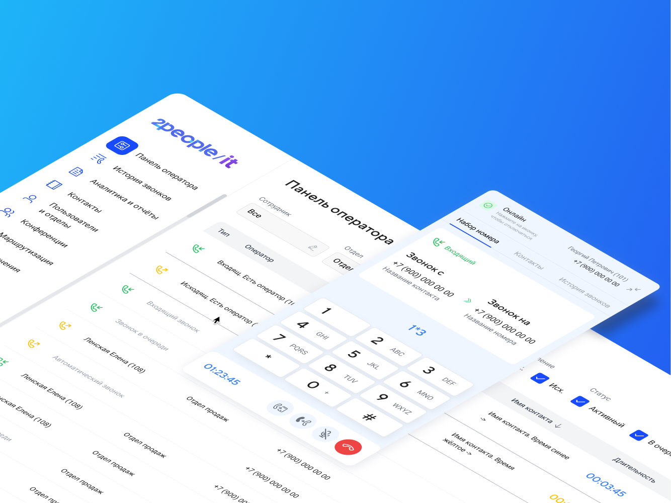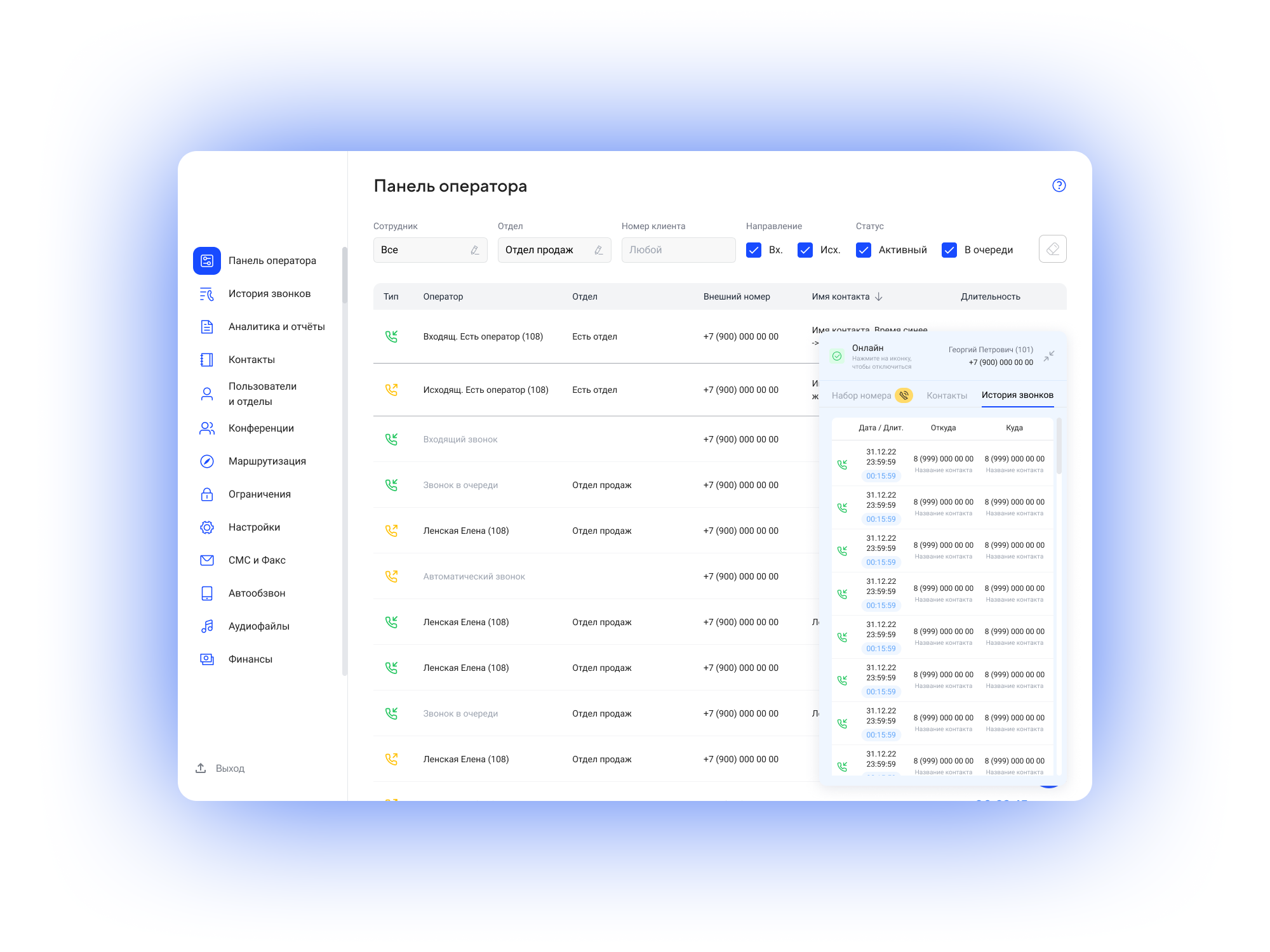 СофтфонВ виртуальную АТС встроен фирменный софтфон (программный телефон), предоставляющий доступ к полному функционалу звонков, предоставляемому платформой. В веб-приложении операторы виртуальной АТС могут: